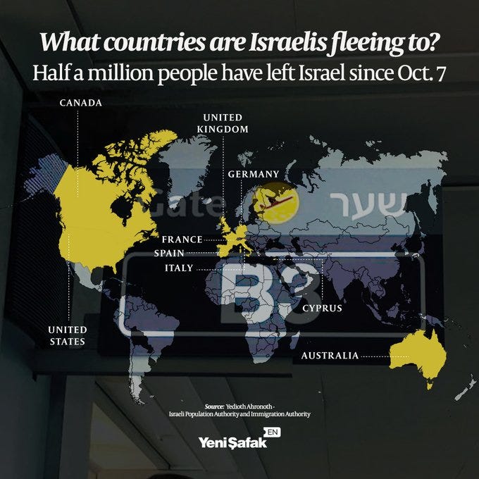 It is hard for me not to connect the mass emmigration of Israeli citizens from Israel to the way the Israeli government is behaving. Instilling fear in Jewish communities across Israel seems to be the goal. Painting the picuture that Israel is the only safe place for Jewish people world wide. If anything Israel has become more dangerous for residents due to the Genocide.