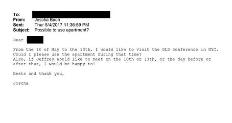 Emails confirm Bach staying at Epstein’s New York apartment during specific date ranges (including May 10–13, 2017)
