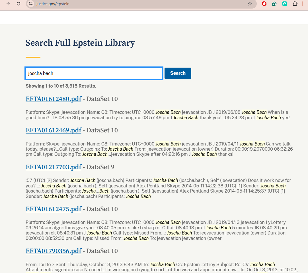 A search for “Joscha Bach” in the released Epstein document library returns 3,915 results.