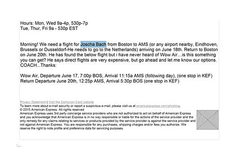 Material shown: Email correspondence, Skype logs, travel coordination, residence scheduling