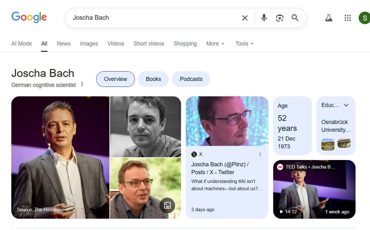 Across the records shown, Joscha Bach is referenced extensively in: